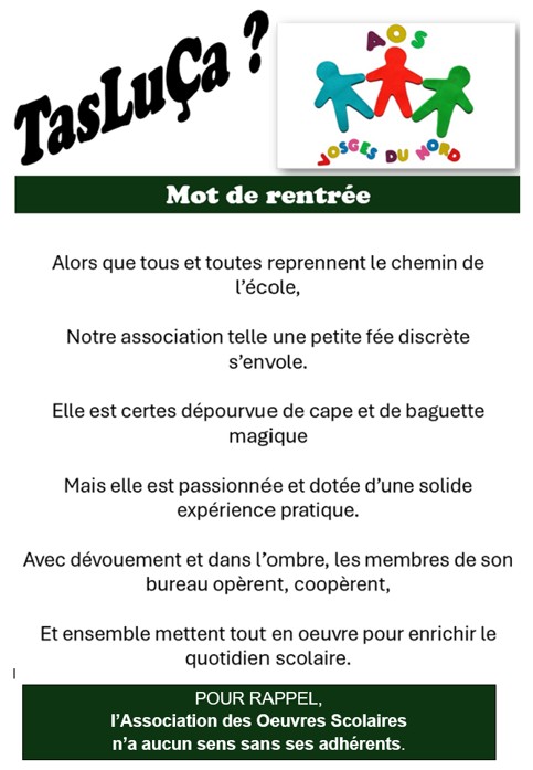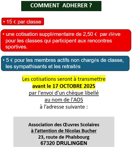 21/09/2025 | Association des Oeuvres Scolaires A télécharger 2025-2026 Note de rentrée Cotisation classes 2025 Cotisation « Sympathisants » Cotisations « Enseignants non chargés de classe »